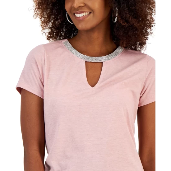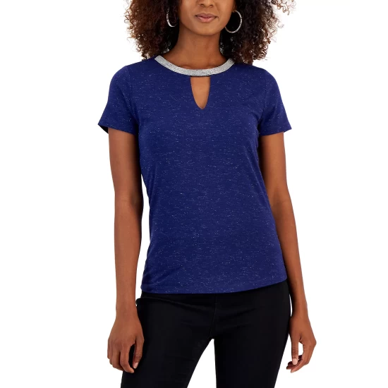 An embellished neckline adds dazzling style to this keyhole top from INC International Concepts.